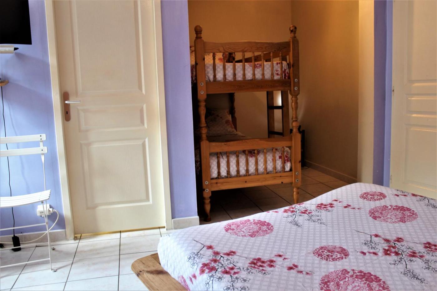 Chambre Familiale. Offering free toiletries, this family room includes a private bathroom with a shower and a hairdryer. The family room has tiled floors, a seating area with a TV, a tea and coffee maker, a wardrobe, as well as heating. The unit has 3 beds.
