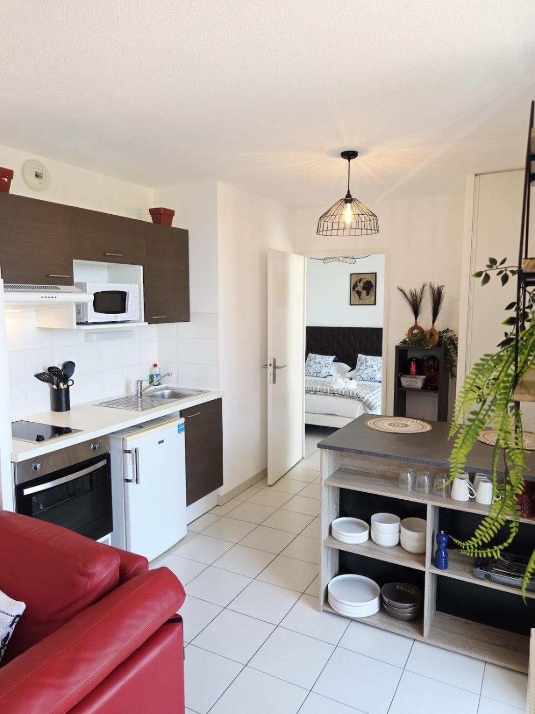 Cet appartement comporte 1 chambre, une télévision à écran plat, ainsi qu’une cuisine.