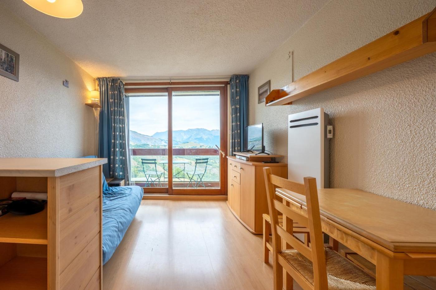 Studio - Vue sur Montagne. A kitchen fitted with kitchenware, an oven and a microwave is available for cooking and storing food. The studio features a private entrance, a coffee machine, a balcony with mountain views as well as a private bathroom boasting a bath. The unit has 2 beds.