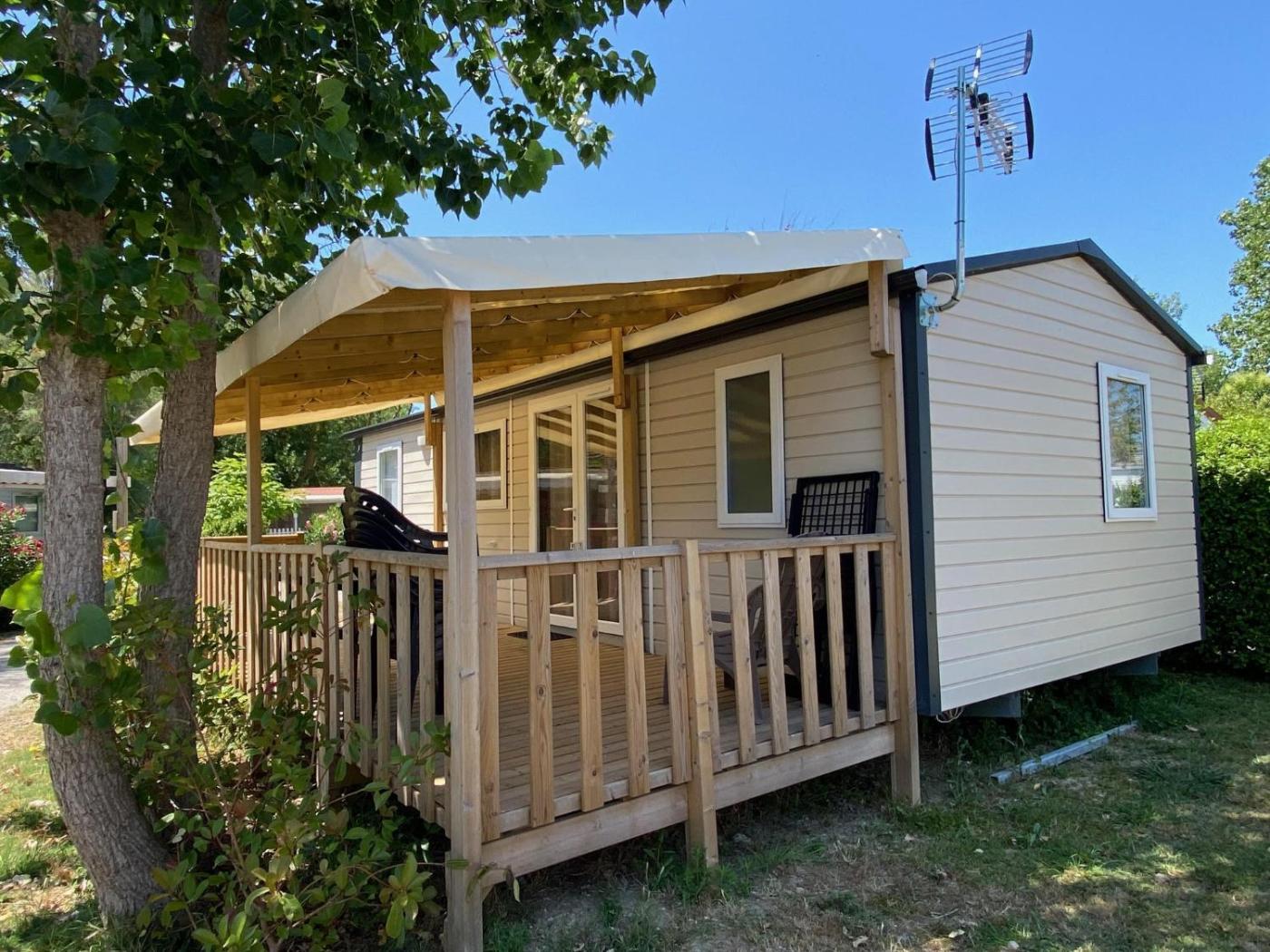 Mobile Home. This air-conditioned mobile home includes 1 living room, 2 separate bedrooms and 1 bathroom with a shower. Meals can be prepared in the kitchenette, which is fitted with a stovetop, a refrigerator, kitchenware and a microwave. Boasting a terrace with garden views, this mobile home also offers a coffee machine and a flat-screen TV. The unit has 3 beds.