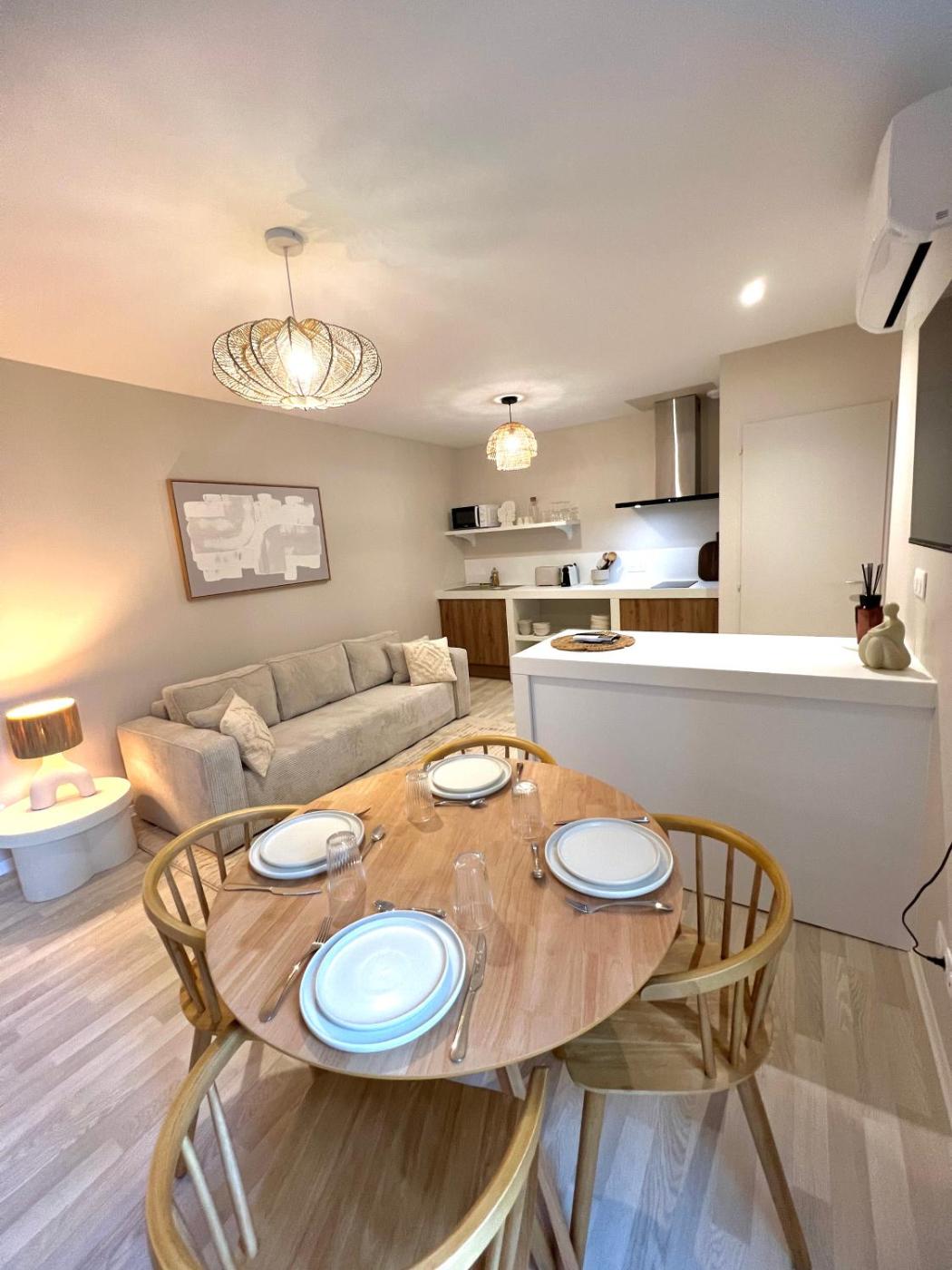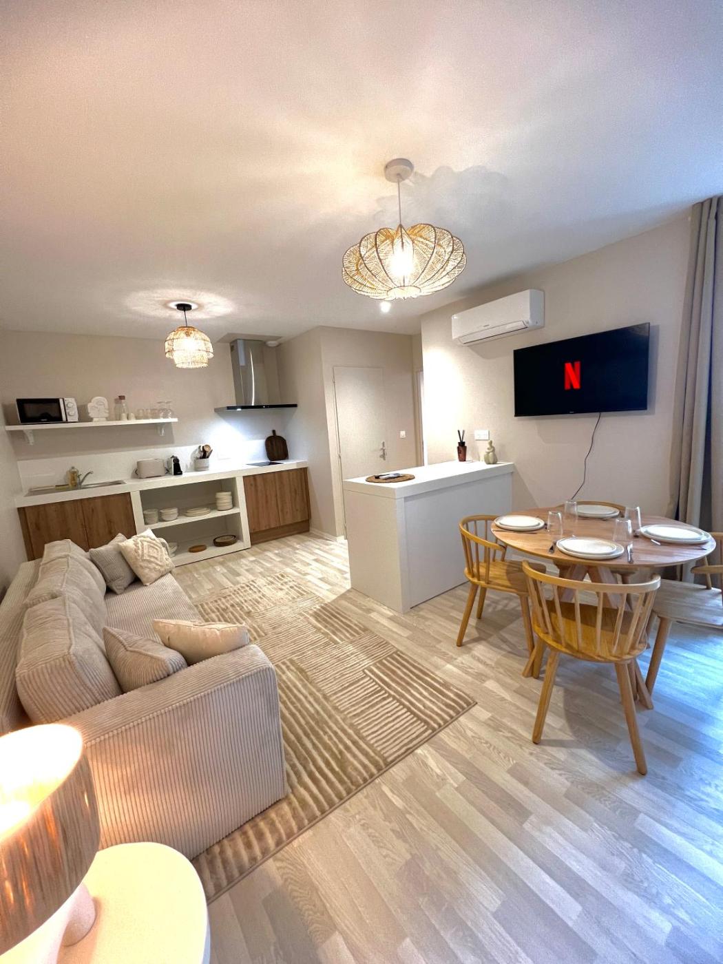 Appartement 1 Chambre. This air-conditioned apartment features 1 living room, 1 separate bedroom and 1 bathroom with a walk-in shower. The well-fitted kitchen has a stovetop, a refrigerator, kitchenware and a microwave. Boasting a terrace with garden views, this apartment also features a coffee machine and a flat-screen TV with streaming services. The unit has 2 beds.